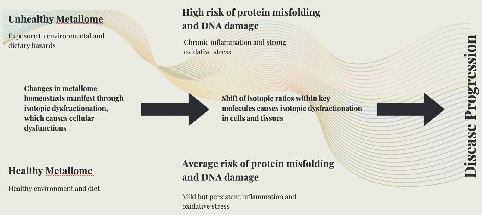 Research shows that in our youth, healthy cells and tissues are enriched with lighter isotopes of essential metals, like Zn and Fe (healthy isotopic fractionation), which shift towards heavier isotopes in cancer cells and as we age. This “isotopic dysfractionation” of stable (non-radioactive) isotopes triggers and amplifies inflammation, oxidative stress, and disruption of cellular homeostasis – leading to disease.